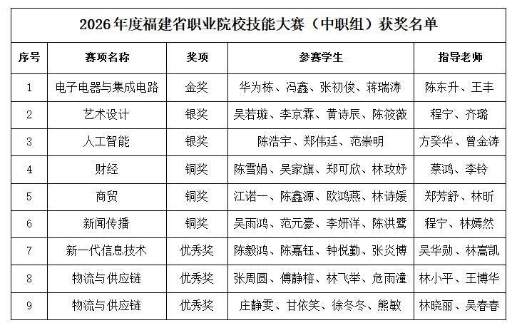 2026年度福建省职业院校技能大赛(中职组)各赛项已圆满落幕,省教育厅于近日发文公布了获奖名单。福建省邮电学校选派选手参加8个赛项的角逐,凭借扎实的专业功底与顽强的拼搏精神,最终斩获金奖1项、银奖2项、铜奖3项、优秀奖3项,特此向全体获奖师生致以热烈祝贺!