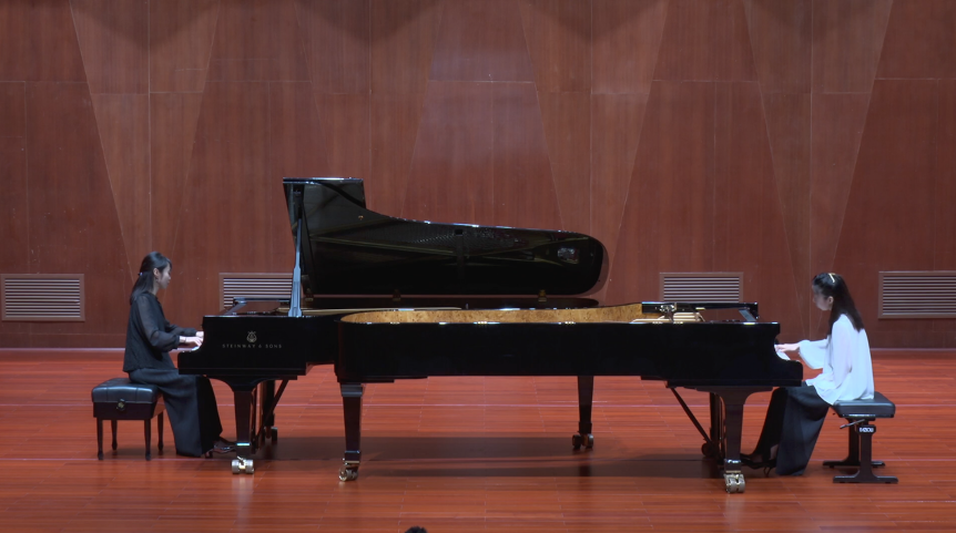 音乐会以双钢琴拉开序幕。石容、石玮共同演绎了肖邦《C大调双钢琴回旋曲》Op.73,琴音交织,瞬间点燃了现场氛围。随后,伍龙轩老师带来肖邦《辉煌变奏曲》Op.12,展现了扎实的演奏功底与对作品的深刻理解。