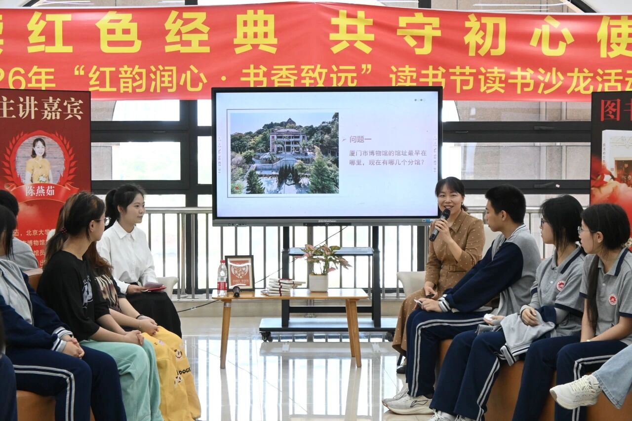 4月20日下午3:00,2026年“红韵润心・书香致远”读书节系列活动之《鼓浪屿红色记忆》主题读书沙龙在集美工业学校图书馆二楼社科馆温情启幕。本次活动由集美图书馆与我校图书馆联合主办,特邀厦门市博物馆郑成功纪念馆副馆长、副研究馆员,厦门市政协特约文史研究员、《鼓浪屿红色记忆》作者陈燕茹担任主讲嘉宾,中高职学生代表到场参与共读交流。