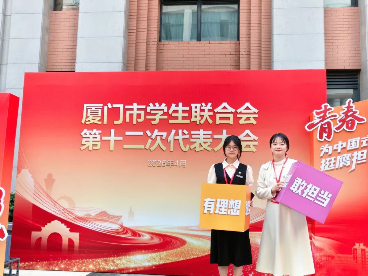 4月26日,厦门市学生联合会第十二次代表大会在集美大学隆重召开。厦门工商旅游学校旅游233班成恩祈、航空231班魏媛芳两名同学作为校学生会成员成功被遴选为正式代表,其中成恩祈同学代表学校当选大会主席团成员;校团委书记黄晴作为列席人员参会。