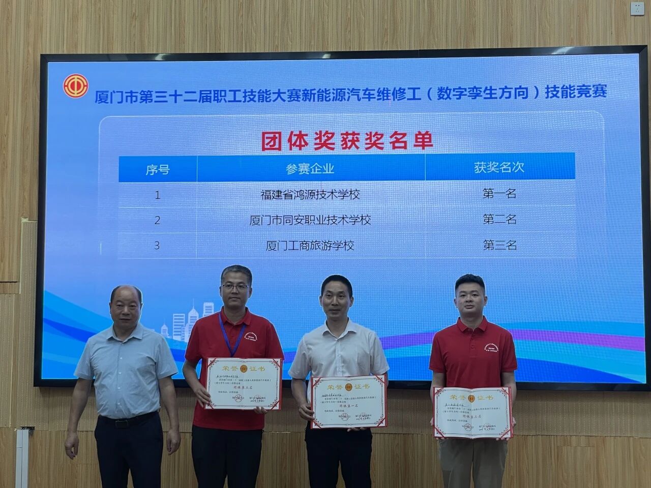 开幕式后,分场次进行理论考试、实操竞赛。赛场上,鸿源技校选手沉着应战、规范操作,凭借扎实理论功底与娴熟实操技能脱颖而出。刘驰凭借稳定发挥摘得个人一等奖,获评“厦门数字工匠”并获5000元奖励;马杨华、林燃晖分获个人三等奖,展现出学校在新能源汽车技术专业的强劲培养实力。同时,学校代表队还以总分第一拿下团体一等奖,实现个人与团体双料冠军。